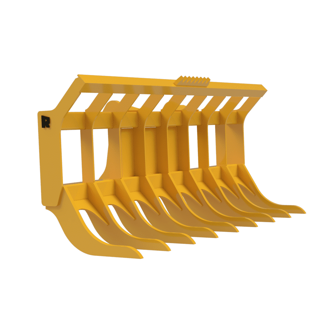 Turn your wheel loader into a land clearing powerhouse with Rockland’s Loader Rake. Built entirely of lightweight, high-strength alloy steel, this attachment digs, rolls, stacks, and loads material with ease. The rugged brush guard equipped with a center-mounted push bar allows you to trap and dig into tall trees with ease. With tough, curved teeth, watch how your machine’s carrying capacity is maximized with every pass. For an extra oomph, custom rake spacing, logos, and wear parts are available upon request.