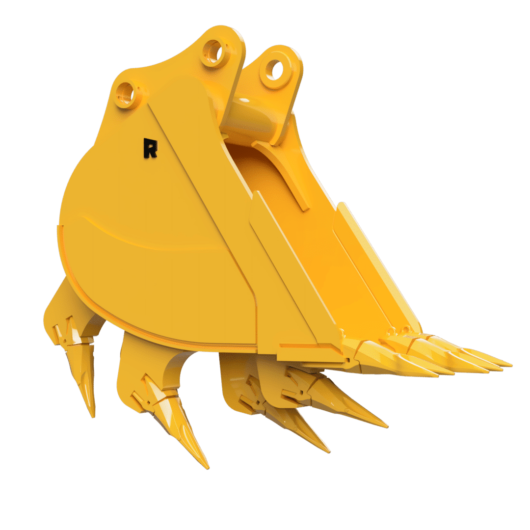 Designed for strenuous quarry digging, the Rock Ripping Bucket features built-in rippers to fracture rocks on every pass. Modified spade-nose lip and staggered teeth create easier, faster penetration while this bucket’s high-strength alloy steel construction guarantees years of dependable performance. Equipped with standard built-in side-cutters and full-body wear plates, this bucket makes short work of even the hardest rocks.